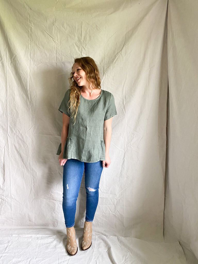 A perfect linen top in my opinion, olive in color + linen in fabrication. This top is easy to just wear with denim + cute shoes, what's not to love about that? It's also really great with chinos, layered with cardigans + put under a tied up top.