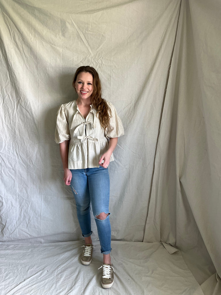 Sourcing made in the USA goods just feels right, and this new brand is one I am so very excited about. A timeless take on a trendy bow front blouse style. Classic ticking stripe to wear open over a tank or dress, or tied up and ready to take on the day.