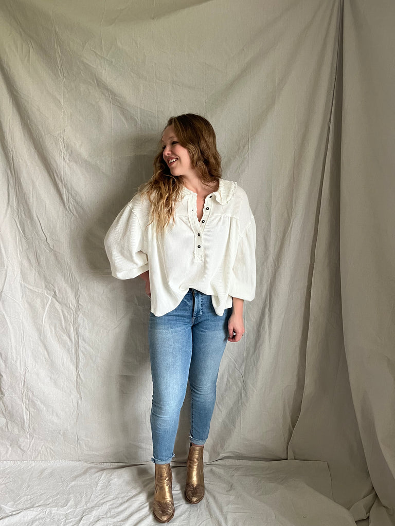 No wardrobe is really ready for the colder months without a thermal blouse. And if it has a cute collar well then that is just even better. This top can be paired with a skirt, tied up over a dress, back to black denim or jeans.