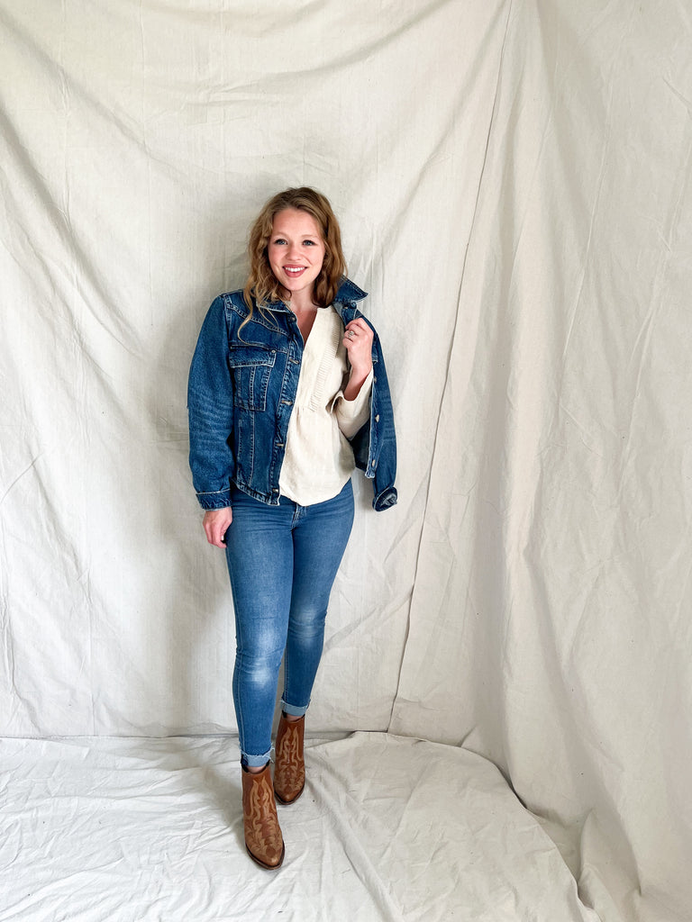 A denim jacket with a few more good details than just the average Joe. This Jacket has the coolest curve hem in the back making it a perfect layer for all those tank dresses in the fall.