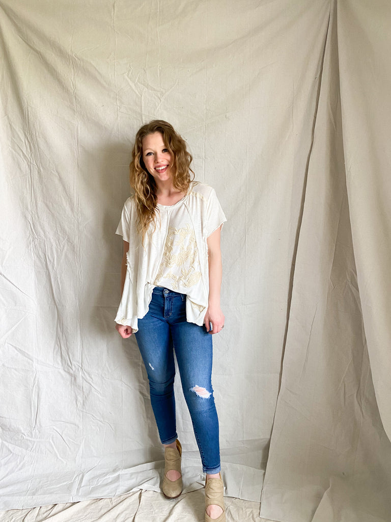 You don't see tops like this just everyday. This style is so effortless unique. A flowy silhouette to be the perfect throw on and go top with dark denim. It's also a good style to pop under a light sweater or jacket!