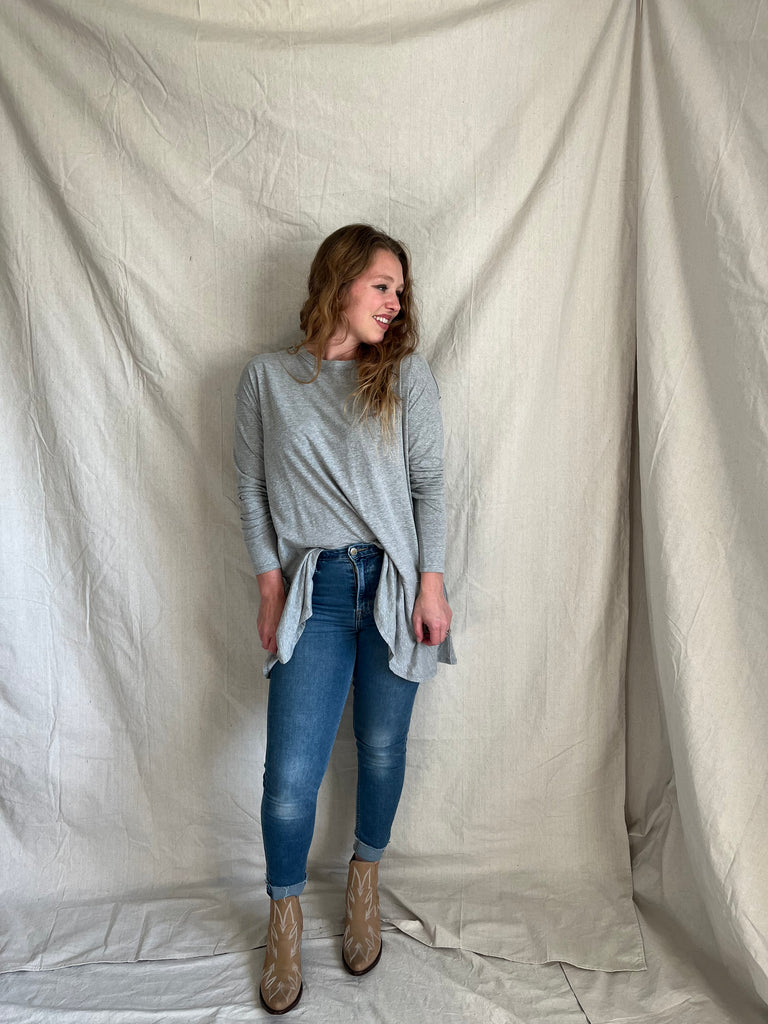 Now, if you are in the mood for some more experimental layering this piece is perfect to knot a thermal over, just saying. But, it is also so good solo, especially for my gals who like a little bit more of a flowy style!