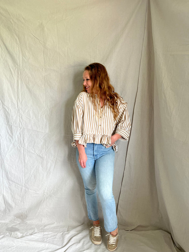 Stripes are always in style. And if it comes with a ruffle hem, count me in. This style of tip is so easy to put with a good pair of denim and out the door ya go. But... you can always put it over a long sleeve tee, under a good jacket, or layered with a cotton knit cropped sweater!