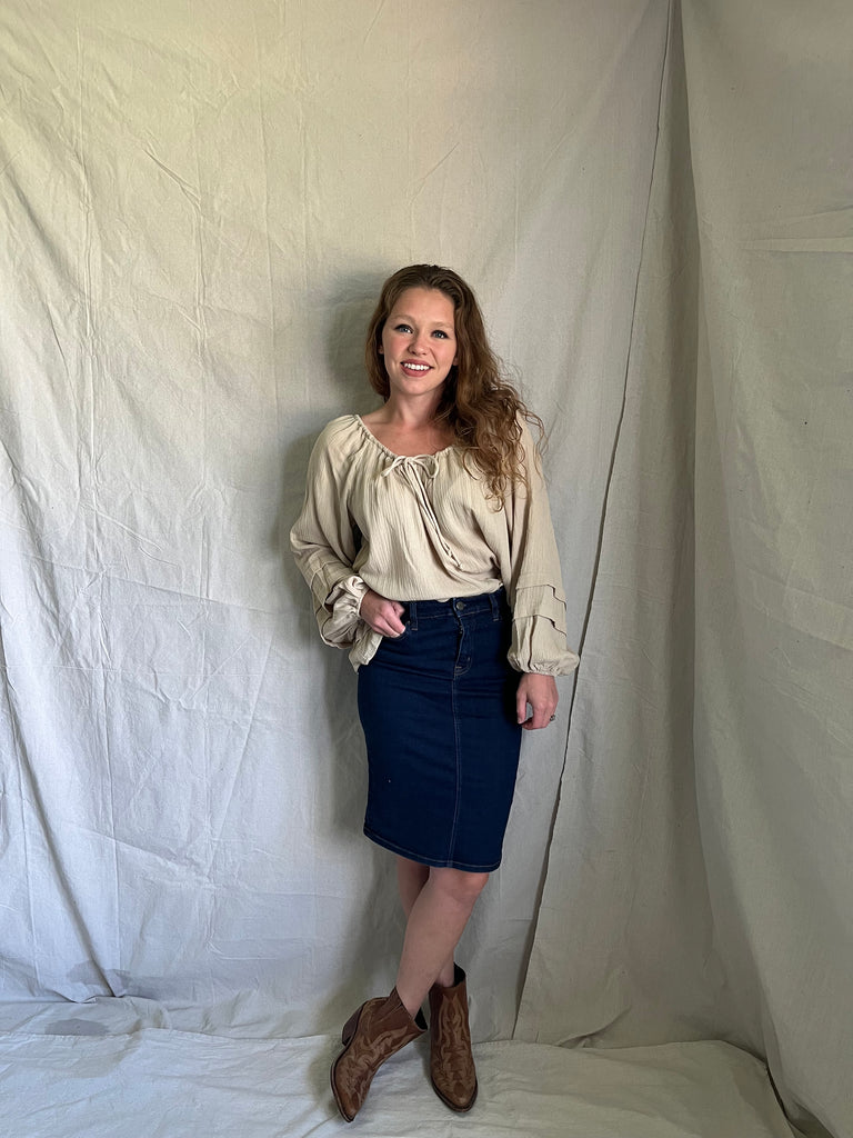 A timeless take on boho, I just love a style like this tied up over a midi dress or a flowy skirt. And bonus points for this style because she goes back to any good denim.