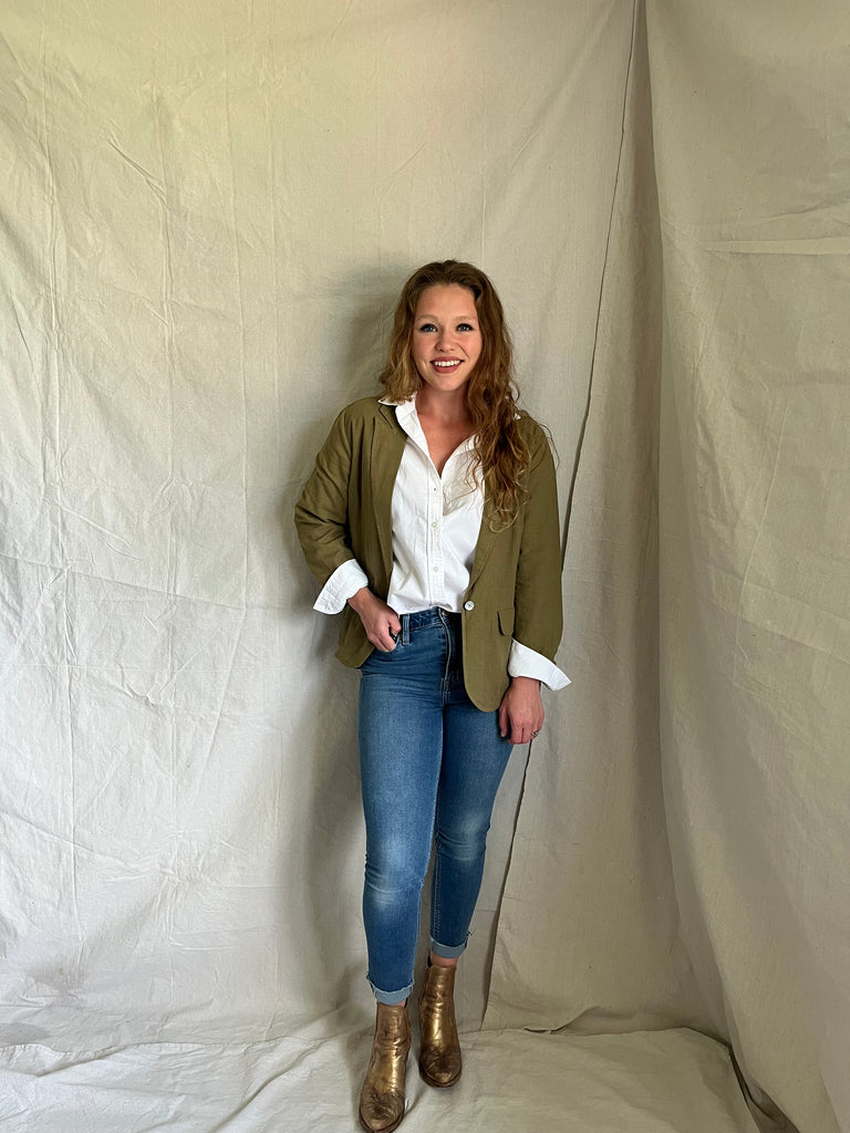 Olive is the new black. And really I think this color can make anyone's look pop. Tastefully tailored and simple, put this over a tee, a tank, a dress, back to business casual. Bonus points if you can put it over a dress with a belt.