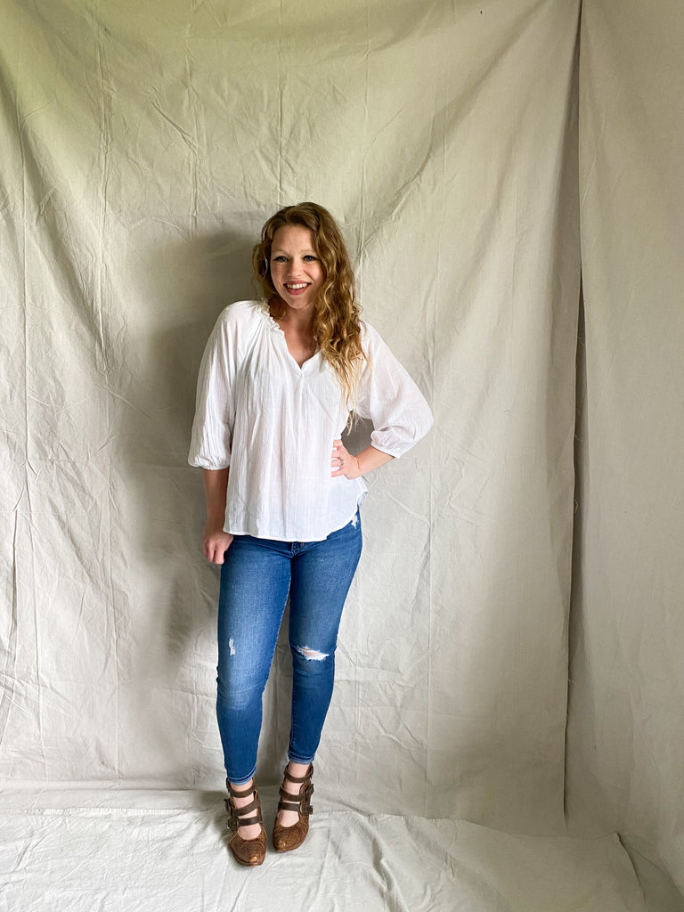 Simple is always better. This top is perfect for a feminine style and will be one of those tops you go to over and over. I love it tied up over a dress or paired back to our favorite pair of denim!
